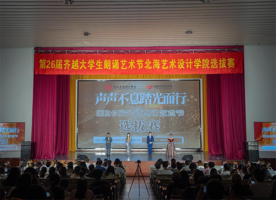 为传承发展中华优秀传统文化,鼓励当代青年探索有声艺术的创新表达,10月13日晚,我校在西校区大礼堂举行第26届齐越朗诵艺术节暨全国大学生朗诵大会北海艺术设计学院选拔赛。学校校长卢新华,副校长包建明,动画与传媒学院党总支书记张帆,院长孙永辉,党总支副书记巴瑞斌,副院长杨红夷、李宗毅等学院领导出席大赛。北海艺术设计学院特聘教授王玥、王伟、王钢、高亮应邀参加此次活动。动画与传媒学院播音与主持艺术专业全体师生现场观摩。