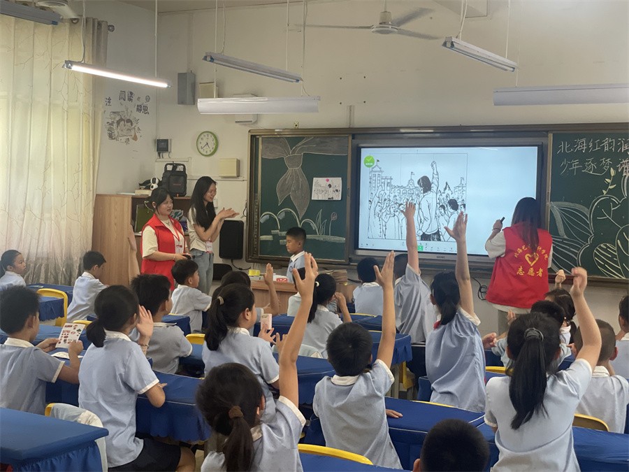 活动通过故事讲述、趣味互动等形式,引导小学生赓续红色血脉,厚植家国情怀。活动中,文学院学生充分发挥专业特长,以北海本土红色资源为依托,精心策划班会内容,各小组通过图文展示、情景故事等形式,生动还原了“涠洲岛抗日武装起义”“斜阳岛革命根据地”等北海革命历史事件,将英雄人物的感人事迹娓娓道来。
