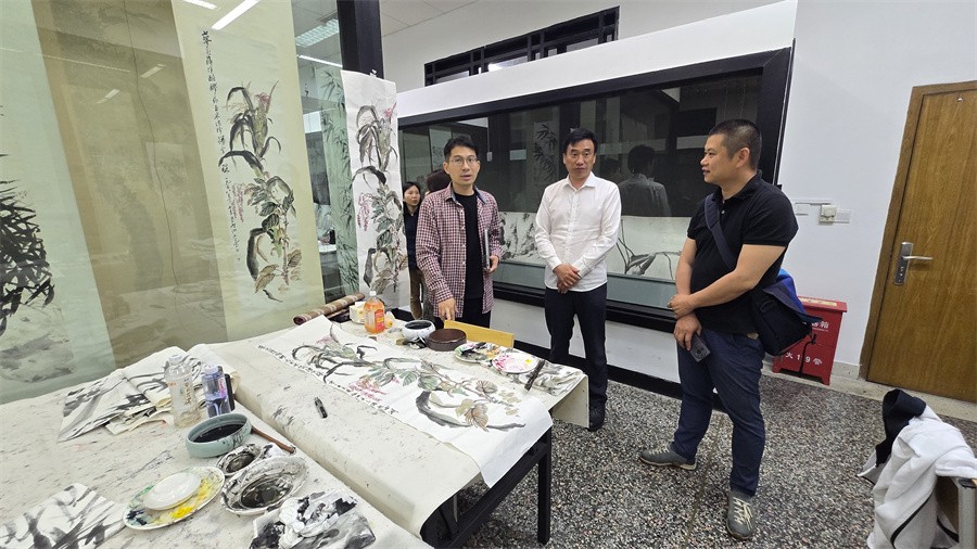 中国美术学院中国画学院综合办公室主任杜昕(右二)介绍学院情况