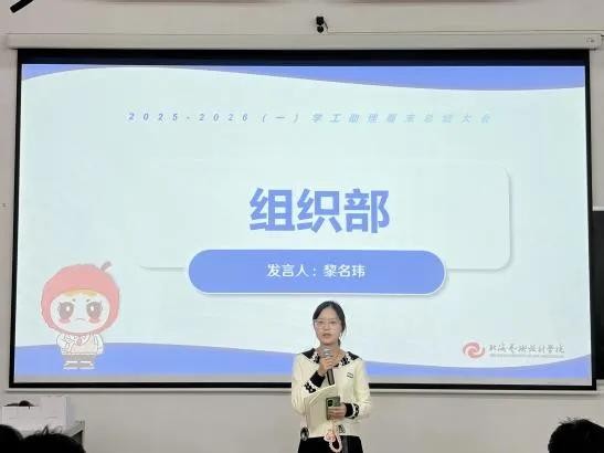 颁奖环节后,班媚部长发表讲话。她首先向一学期以来为学生工作默默奉献的全体学工助理表达了衷心感谢,并特别强调,学工助理岗位不仅是服务的平台,更是锻炼与成长的宝贵机会。她鼓励大家珍惜在岗位中的实践经历,在服务同学中涵养奉献精神,在应对挑战中锤炼综合能力,在各类活动中提升责任意识,真正实现在工作中学习、在实干中成长。
