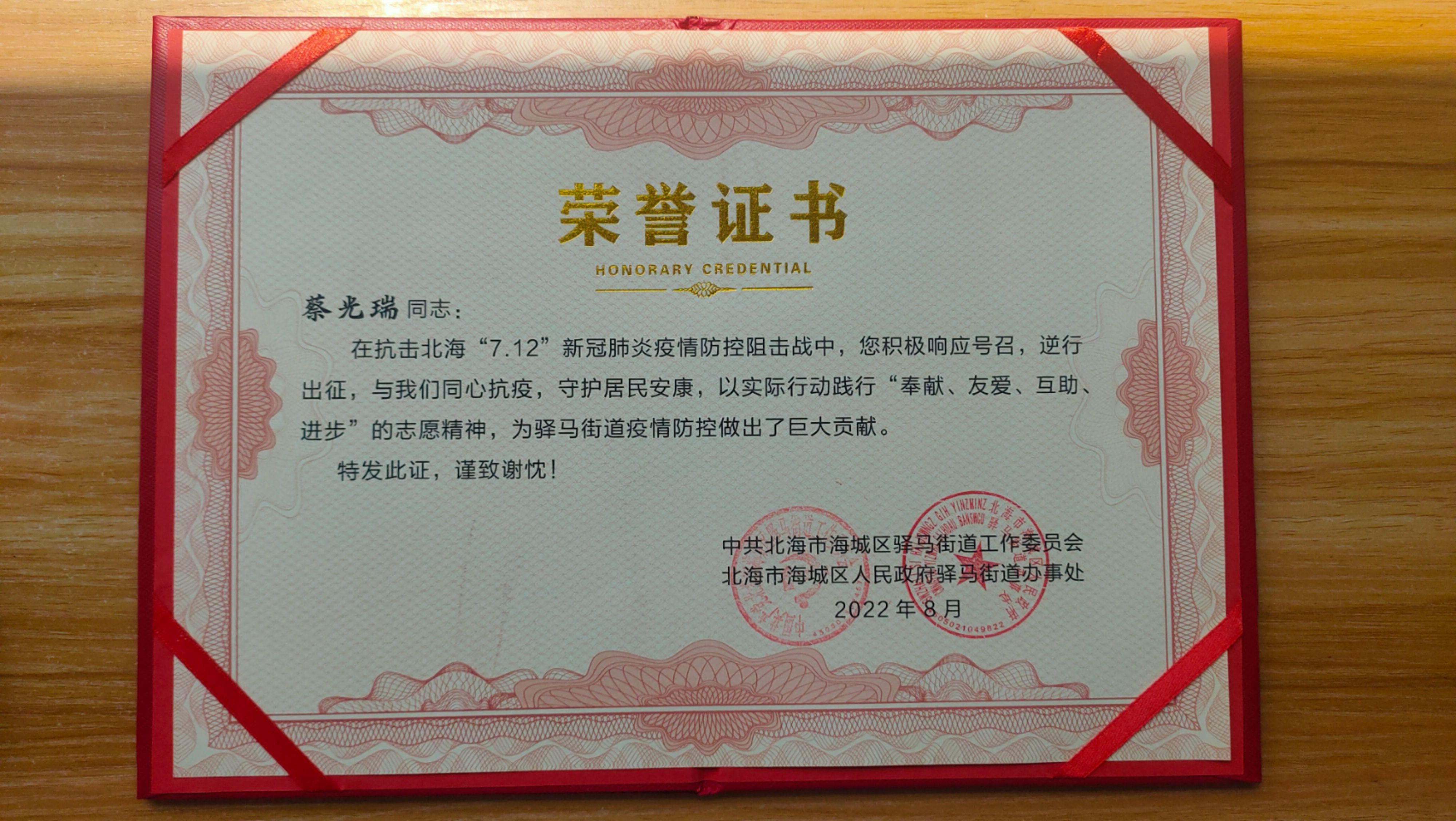 2022年7月北海发生了使全市“宕机”一个月的严重疫情,在突发灾难面前,许许多多的志愿者站了出来,他们不顾自身安危,积极响应疫情防控狙击战的号召,逆行出征,与政府工作人员一道同心抗疫,守护居民安康,为北海市疫情防控做出了巨大贡献。北艺设备与信息处的蔡光瑞老师就是其中一份子,由于他出色的志愿工作,他所在的社区为他颁发了“抗疫勇士”荣誉证书! 你我皆平凡,危难之时方显英雄本色,我们为身边有这样的勇士而感到安心和自豪,向勇士们学习!(黎添祥/摄)