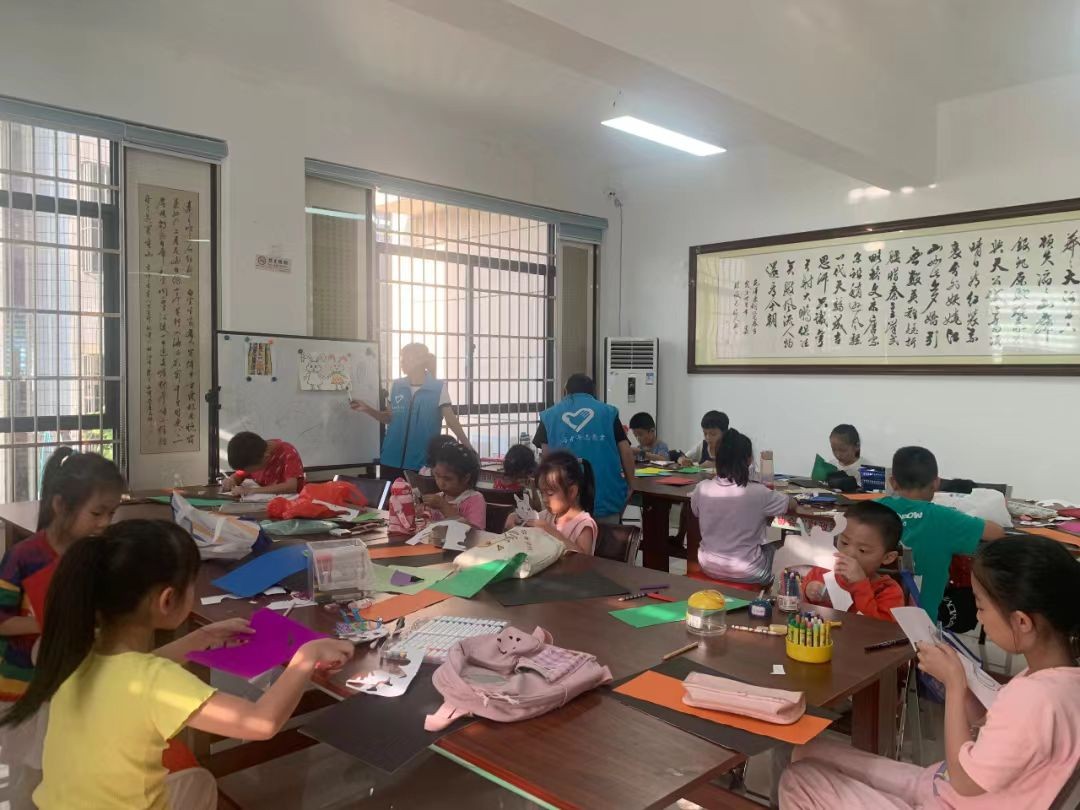 到了疍家小镇,“我们今天的主题是海底的小鲨鱼!”,小朋友们非常兴奋,志愿者们为他们讲述细节,修改色彩运用。不一会,一幅充满自然气息的绘画就完成了。小朋友们举起自己的画在镜头留下了满足的笑容。